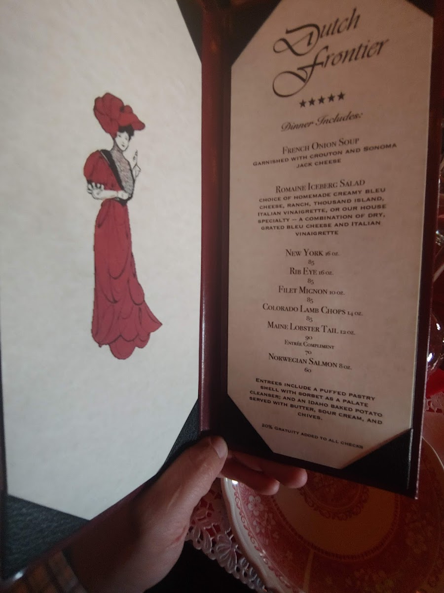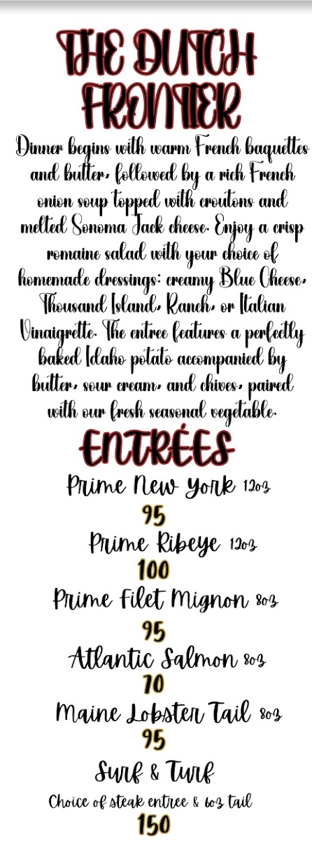 The menu at Dutch Frontier Restaurant offers a range of mouthwatering entrees that cater to a variety of tastes. Filet Mignon, a tender and juicy cut of beef, is a classic choice for steak lovers. For those who enjoy a more marbled texture, the Ribeye promises a rich, flavorful experience. Seafood enthusiasts can savor the New York Salmon, known for its delicate texture and fresh taste, or opt for the indulgent Maine Lobster Tail, a luxurious treat that’s perfect for any occasion. Whether you're craving a perfectly cooked steak or fresh seafood, the menu at Dutch Frontier Restaurant delivers a satisfying experience.